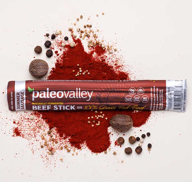 Paleovalley 100% Grass Fed Beef Sticks are the only beef sticks in the USA made from 100% grass fed/grass finished beef and organic spices that are naturally fermented.